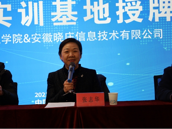 张志华对安徽晓庄信息技术有限公司席时雍董事长一行的到来表示热烈欢迎,并介绍了学院的基本情况。她指出,校企合作既能发挥学院和企业的各自优势,又能共同培养社会与市场需求的人才,是实现校企合作双赢的模式之一。此次协议的签署,将会进一步加快校企双方在人才培养、专业共建等领域的合作步伐,从而为双方在今后的合作发展道路上实现共赢提供更为广阔的空间和更加坚实的平台。