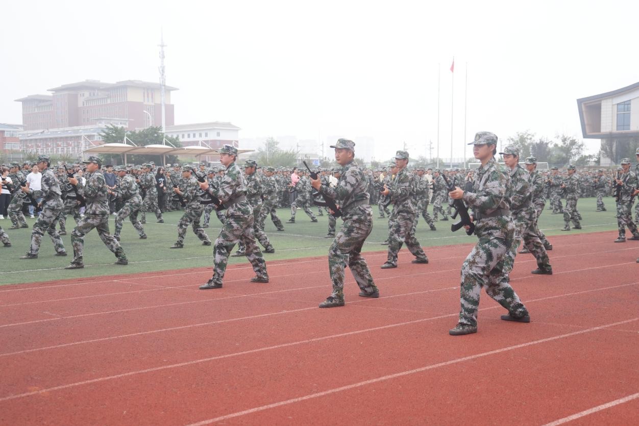 伴随着庄严的国歌声,五星红旗冉冉升起,全体参会人员肃立行注目礼,大会正式拉开帷幕。随后,军训成果汇报环节展开,新生们以饱满的精神状态依次展示训练成果。分列式方阵步伐整齐、口号响亮;军体拳与刺杀操表演刚劲有力、动作干净,展现出昂扬的青春风貌。