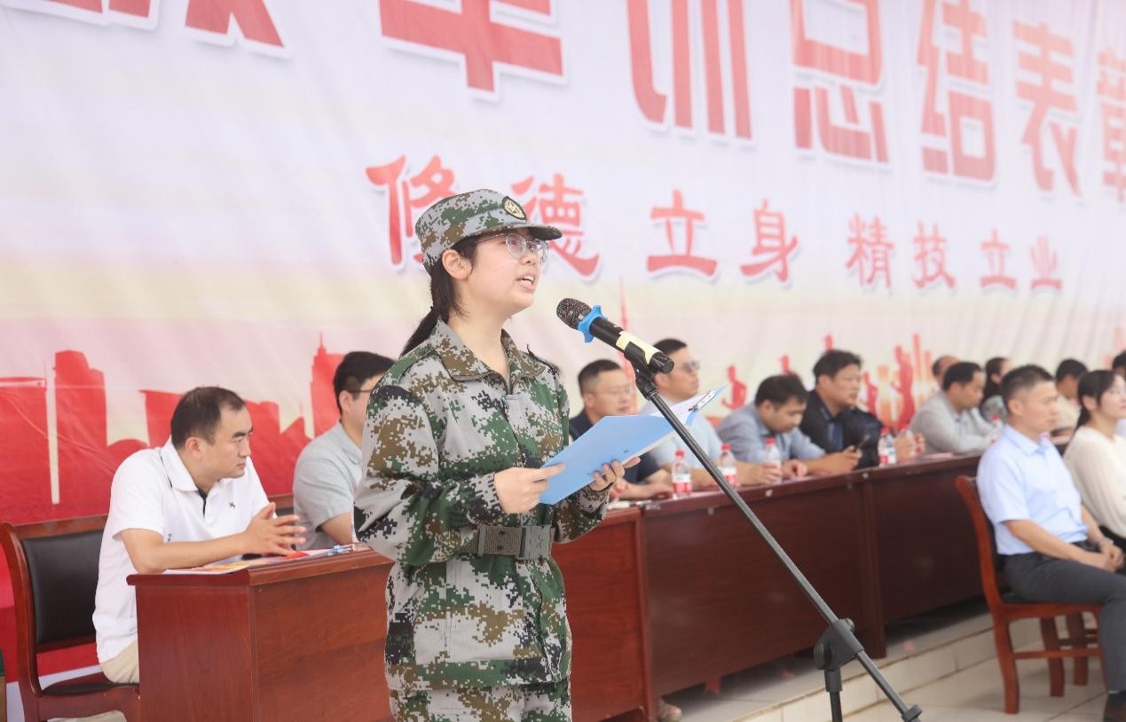 参训新生代表姜欣悦分享了军训期间的成长与感悟。她表示,军训不仅锤炼了意志、强化了纪律意识,更让大家体会到团结协作的重要性,将以更饱满的热情迎接大学生活。教官代表李天宝肯定了同学们的刻苦表现,并希望大家将军训中养成的优良作风延续到今后的学习生活中,勇担青春使命。