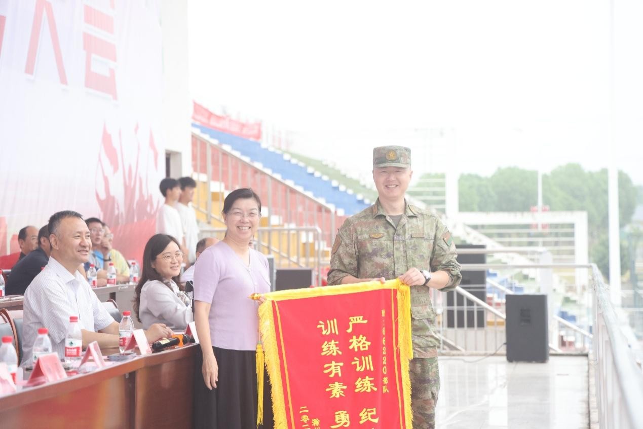 杨如江宣读表彰文件,校领导为在“军训综合考核”中获奖的集体颁奖。牛春雨代表学校向承训部队赠送锦旗,表达对全体教官辛勤付出的感谢,也见证了学校与部队在军训中结下的深厚情谊。