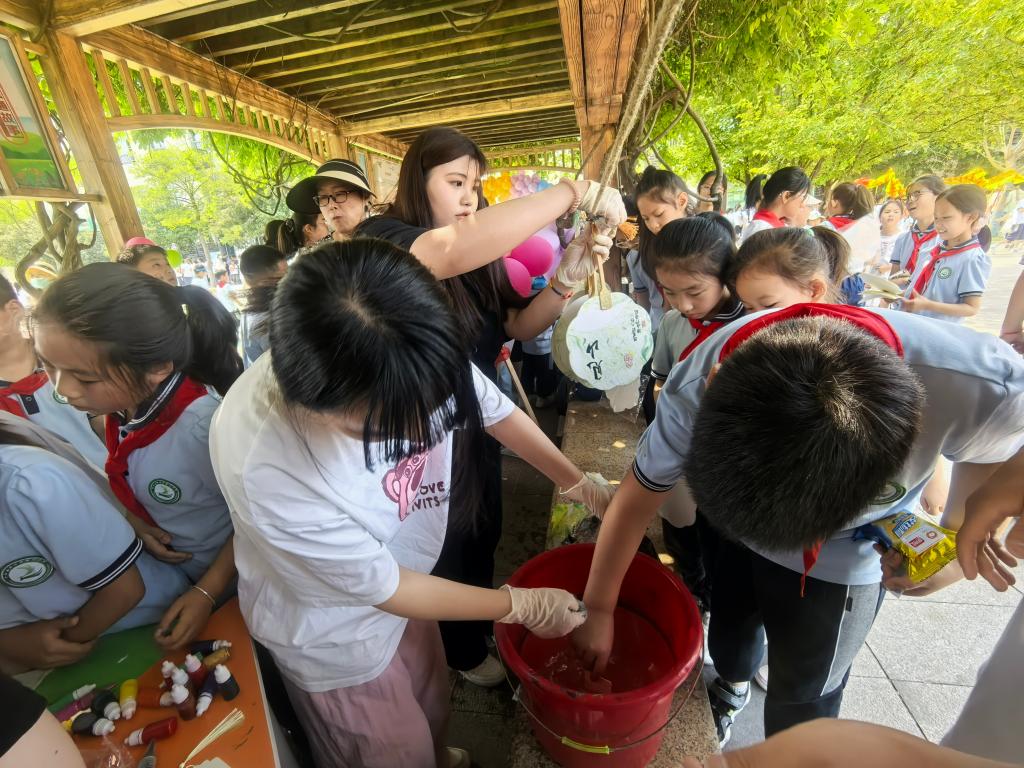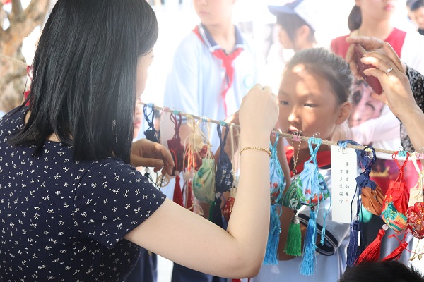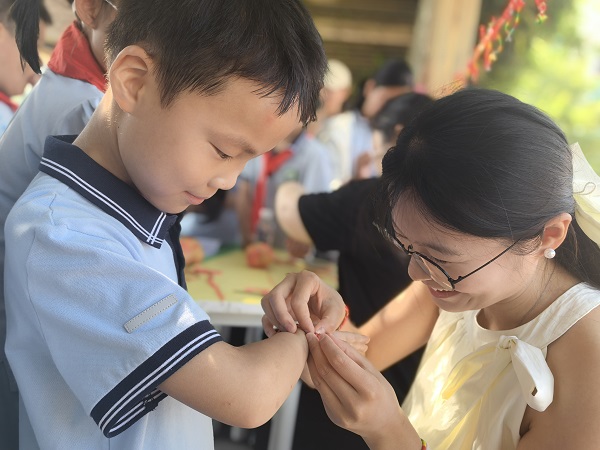 与此同时,非遗体验区同样热闹非凡。紫藤长廊上摆满了丰富多彩的漆扇,孩子们用画笔,将粽子、龙舟、艾草等端午元素描绘其上;香囊、五彩绳制作区,五颜六色的布料、丝线和中药材散发着淡淡清香,孩子们在志愿者的指导下填充香料,编织彩绳,当香囊挂在胸前,彩绳戴在手上,他们不仅收获了一份节日礼物,更感受到了传统文化的美好寓意。