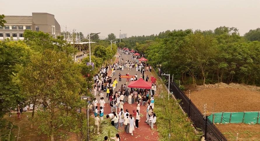 5月26日,城院南广场变身“流动的文化博物馆”。两条金龙首尾相衔,围绕“蛛形”绣球腾挪翻转,金鳞在阳光下闪烁,龙身飞旋如流动的火焰。广袖翻飞间,汉服方阵以魏晋风骨为墨、盛唐气韵为纸,勾勒千年华夏衣冠华章。川剧变脸艺人以行云流水般的技法,指尖轻拂间十余张脸谱如幻蝶翩跹,红黑青金在光影交错中瞬息更迭,引得现场掌声雷动。这场精心编排的开幕式表演,以"非遗+艺术"的现代演绎方式,将《东京梦华录》的宋韵与《天工开物》的匠魂熔铸为视觉奇观。