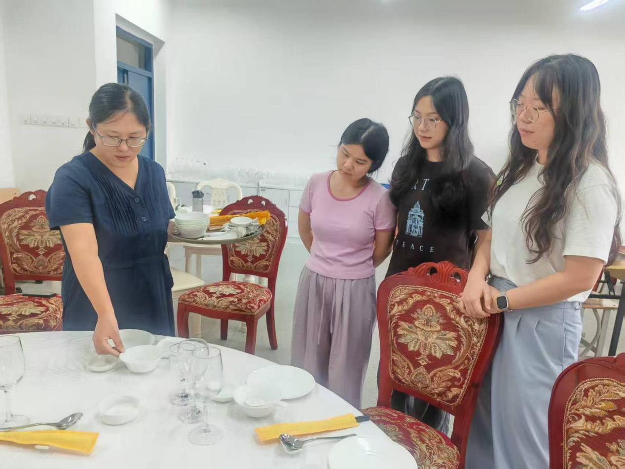 此次培训由管理学院专业教师团队精心策划实施,以“理论筑基、实操强能”为核心,围绕形体礼仪、会务服务、客房服务、餐饮服务四大模块展开系统教学。培训期间,学员们在学院理论课教室完成理论知识学习,先后前往餐饮实训室、金鹏广场酒店客房部、凯迪温德姆至尊豪庭大酒店开展实操训练,通过“模拟场景演练+真实岗位实践”相结合的方式,熟练掌握了服务规范与实操技能。结业前的综合考核中,学员们在会务场地布置、客房标准化清洁、中西餐摆台等实操环节表现突出,考核通过率达100%,充分展现了扎实的学习成果。