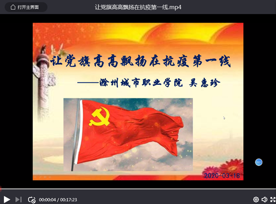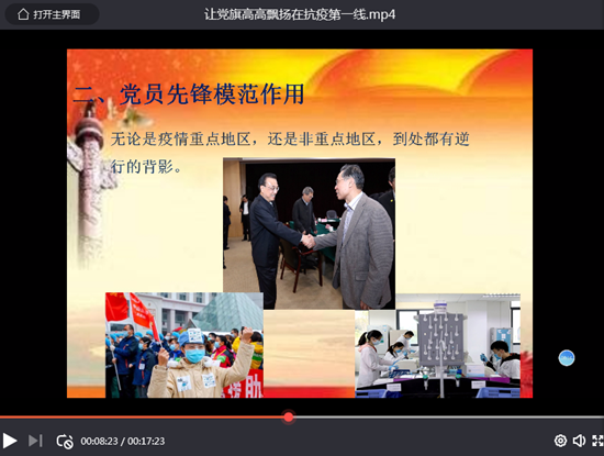 医学系党总支书记吴惠珍针对疫情期间“停课不停学”的号召,以网络教学形式给医学系全体党员上了一堂“让党旗高高飘扬在抗疫第一线”的党课,她从“疫情回顾”、“发挥先锋模范作用”、“坚持初心和使命”、“结语”几个方面讲授了广大党员干部如何坚守初心于使命,成为抗疫战场上的硬核力量的。