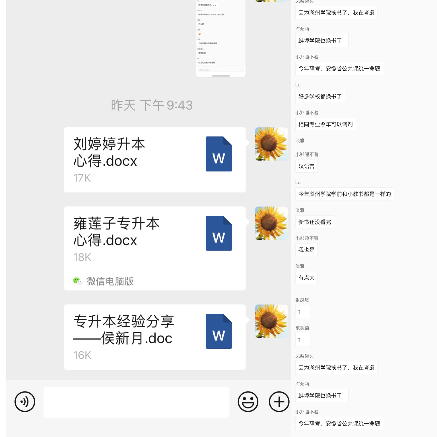 三位成绩优秀已成功升本的来自滁州学院小学教育专业、蚌埠学院学前教育专业和合肥学院学前教育专业的同学分别从目标、坚持、学习的计划和方法、信心和态度这六个方面进行了分享。她们每个人根据自己的备考和考试经验,详尽的分享了自己的学习方法、学习态度和学习诀窍等,大到知识的结构框架,小到错题本的使用方法,讲的具体、讲的耐心。会后他们与2020届毕业班的学弟、学妹们就他们关心的专业、升学、就业等方面问题进行了深入交流。