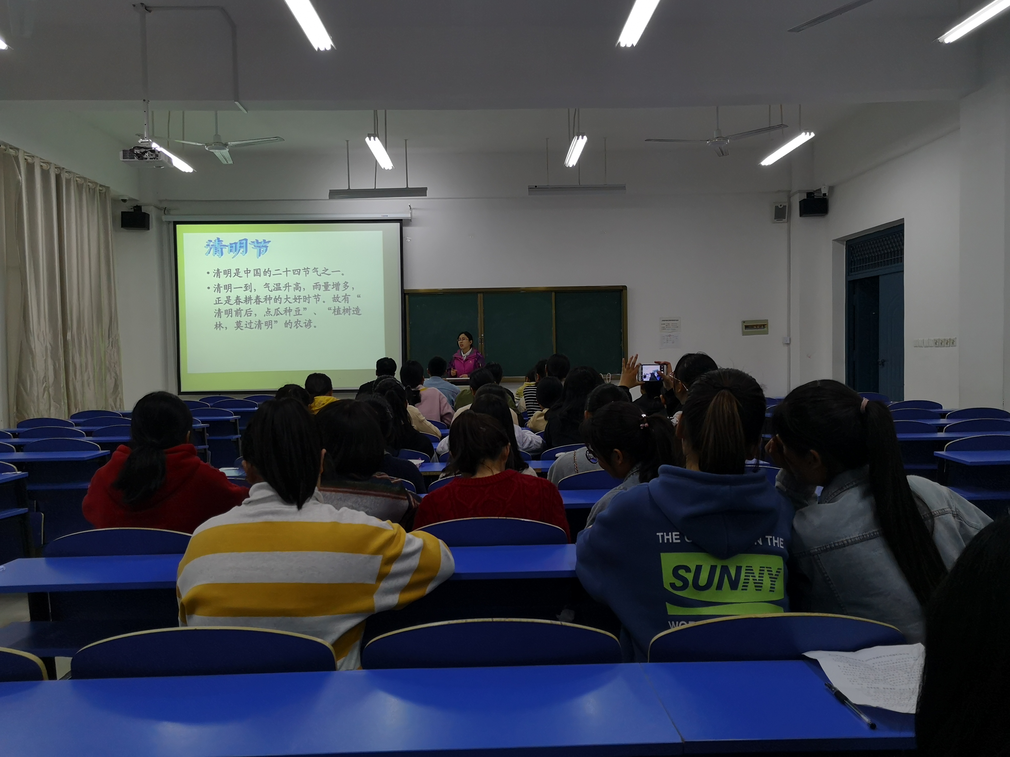 当天下午护理系团总支书记秦海娇老师在b1 102开设了以“我们的节日——清明节”为主题的讲座活动。在讲座中秦老师主要介绍了清明节的由来、传统习俗以及对先烈的缅怀。并且也提出文明祭扫、绿色祭扫的环保观念。最后秦老师希望大家在传承中华民族传统习俗的同时也要发扬优秀的传统美德,号召同学们积极参加网上祭英烈活动,为革命先烈献花,缅怀革命先烈,继承革命遗志,努力学习,报效国家。