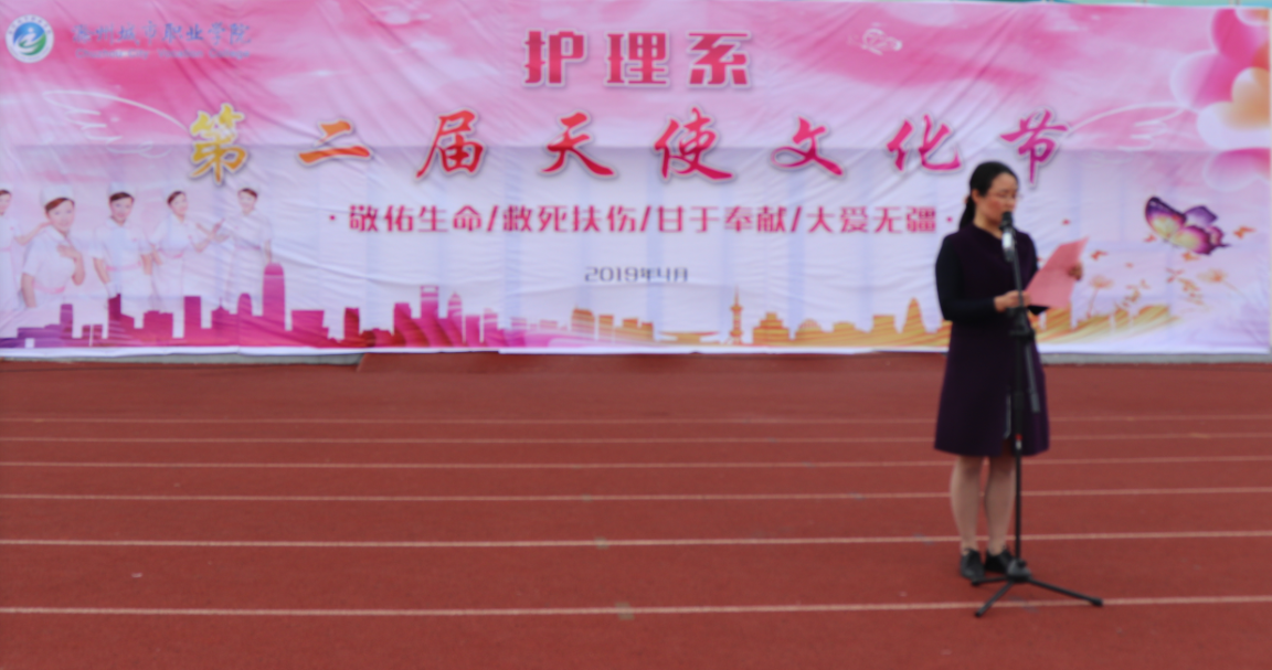 系党总支书记蔡季秋致文化节开幕词。她在讲话中指出,随着新时代的到来,卫生事业改革快速发展,人们对护理工作也提出了更新、更高的要求,更需要护理工作者具备良好的专业素质、精湛的技能和与患者沟通的技巧以及和谐的人际关系。开展主题为“不忘初心放飞梦想争做新时代白衣天使”的天使文化节就是适应新时代新要求的新举措。蔡季秋要求全体护生都要参与到文化节的各项活动中来,始终牢记南丁格尔誓言,牢记自身肩负的神圣使命,发扬奉献博爱精神,以青春的激情、饱满的热情、敢闯敢试的豪情,不断学习钻研,用实际行动不辱使命,为人民健康保驾护航。