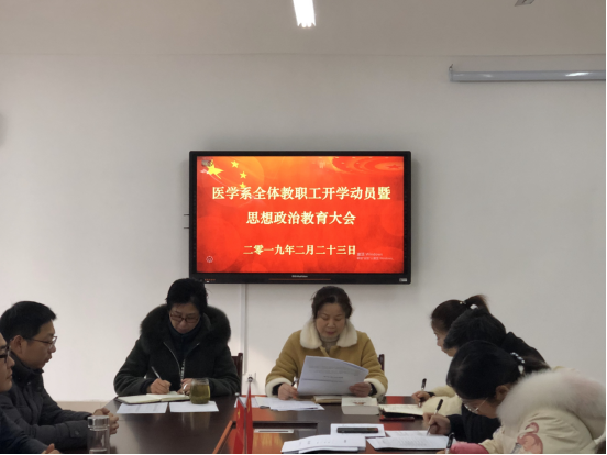 学期伊始,为使各项事务尽快步入轨道,2月23日上午,医学系组织召开了全体教职工开学动员暨思想政治教育大会,会议由副主任毕璧主持,主任吴惠珍,系党总支副书记徐立娟及全体教职工参加了学习会。
