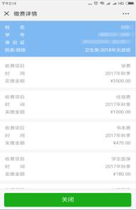 第二步:输入姓名及学号(新生输入考生号),查询缴费信息,点击“缴费”,在弹出的明细框中点击“支付”,进入确认支付页面;