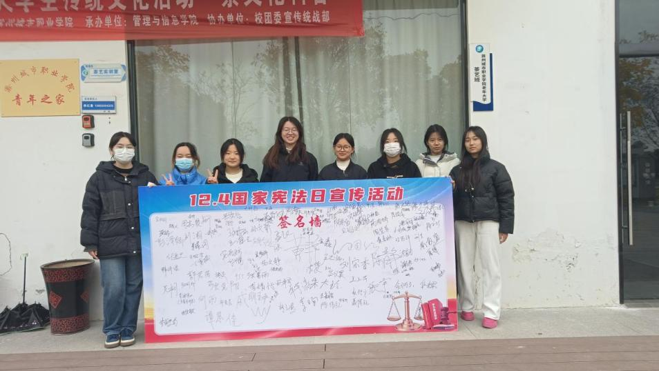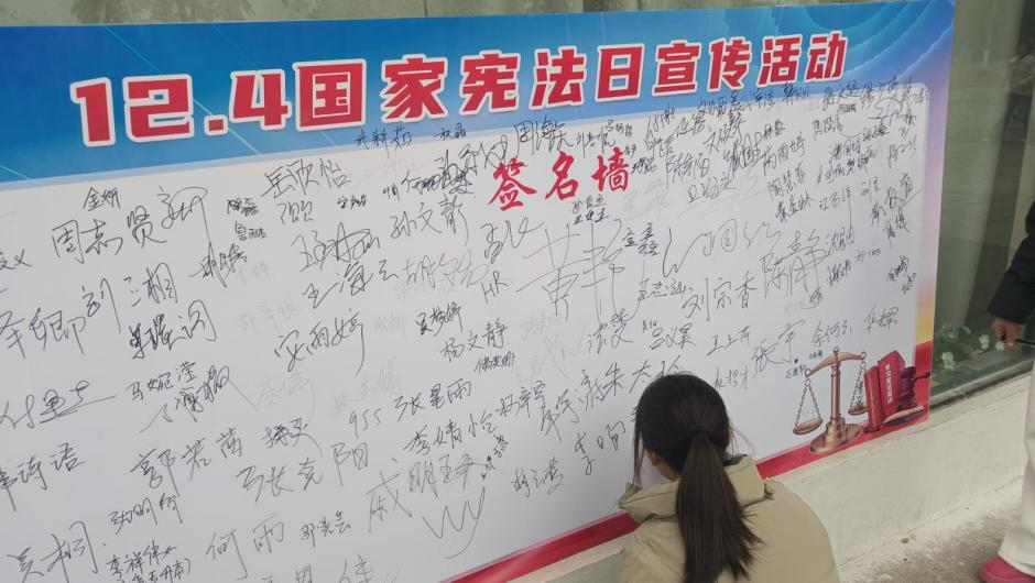 为在全校营造“崇尚宪法、学习宪法、宣传宪法、遵守宪法、维护宪法”的浓厚氛围,我校组织青年志愿者开展宪法“签名墙”活动。宪法“签名墙”环节,同学们有序排队,在背景板指定位置签字留念,以自己的姓名向宪法郑重承诺,将其作为自己的行为准则,活动增强广大青年学子的法律意识,提升了同学们的法治观念,营造了良好的学习氛围。